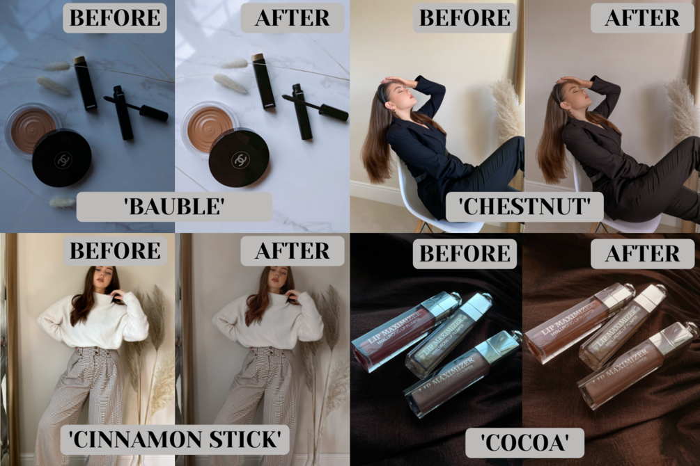 Cookie is a rosey-white toned filter that works perfectly for flatlays or product shots with neutral backgrounds (greys, creams, whites etc). This filter looks great on well-lit outfit shots too, either indoors or outdoors. For some, the skin colour may need adjusting manually.