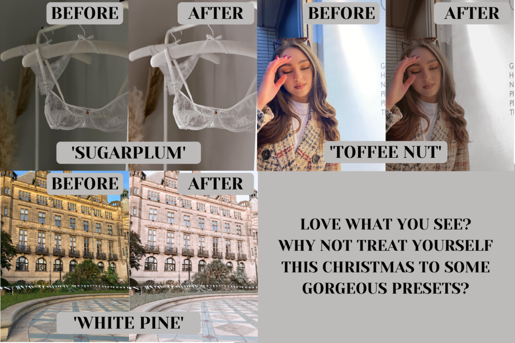 These presets are fabulous for any type of image, whether that be a selfie, flat-lay, outfit shot, architectural shot, indoor shoot and the list goes on!